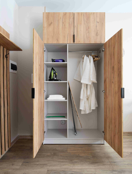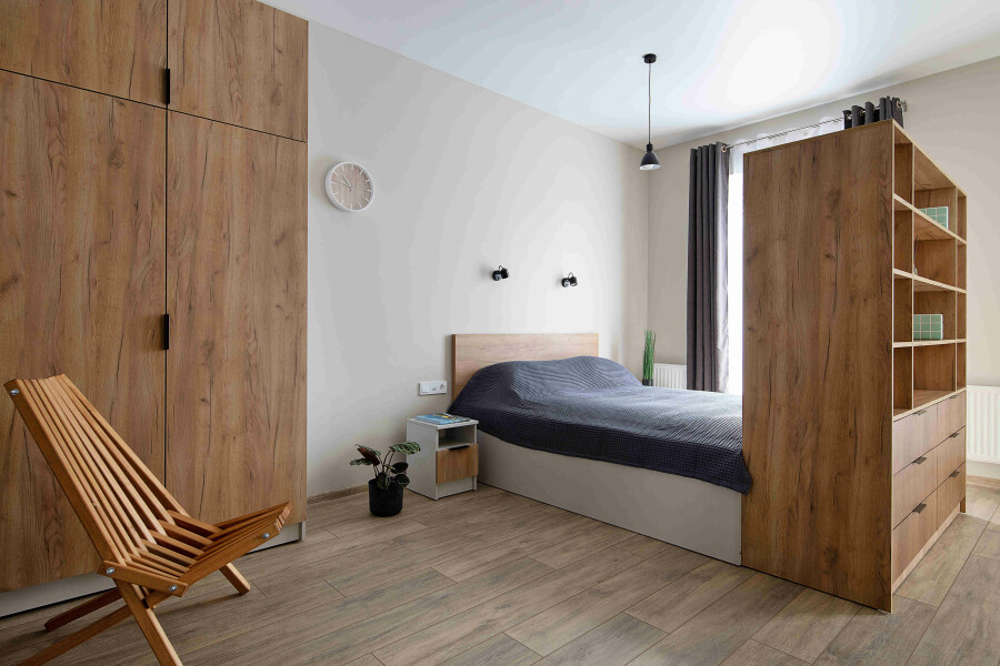 - Мебель: вешалка, кровать двуспальная, стол, стулья, шкаф