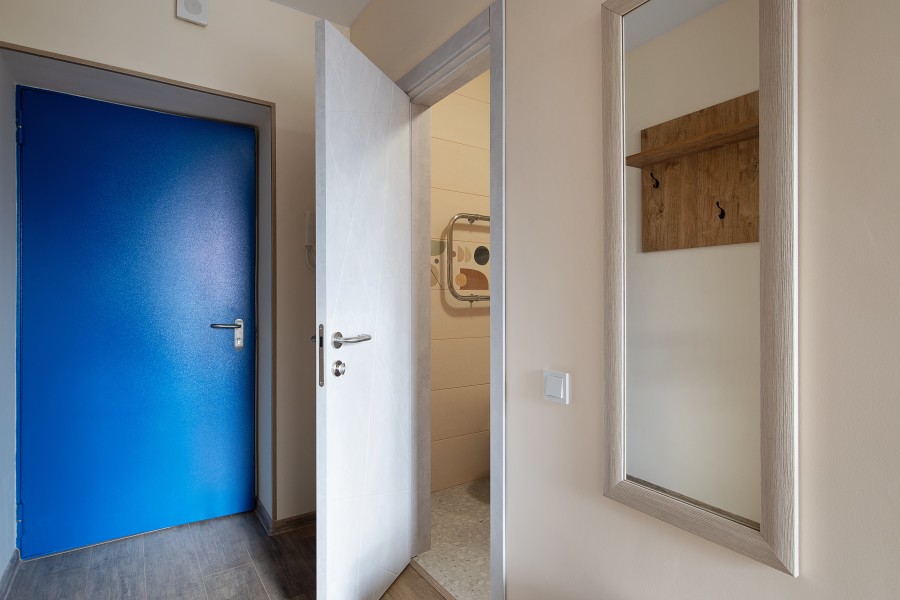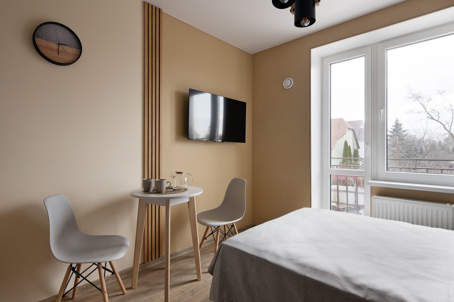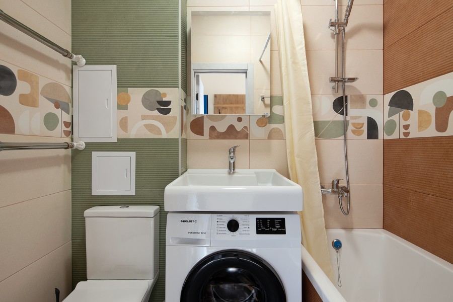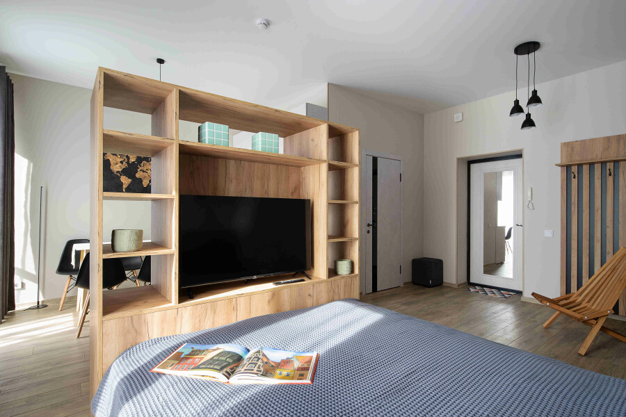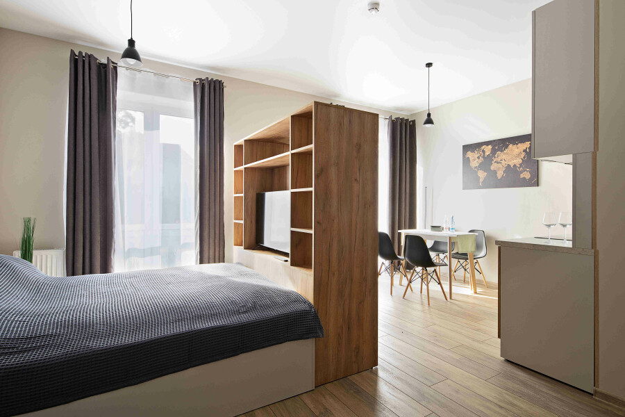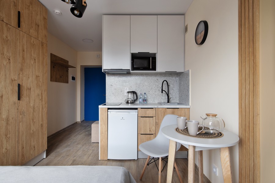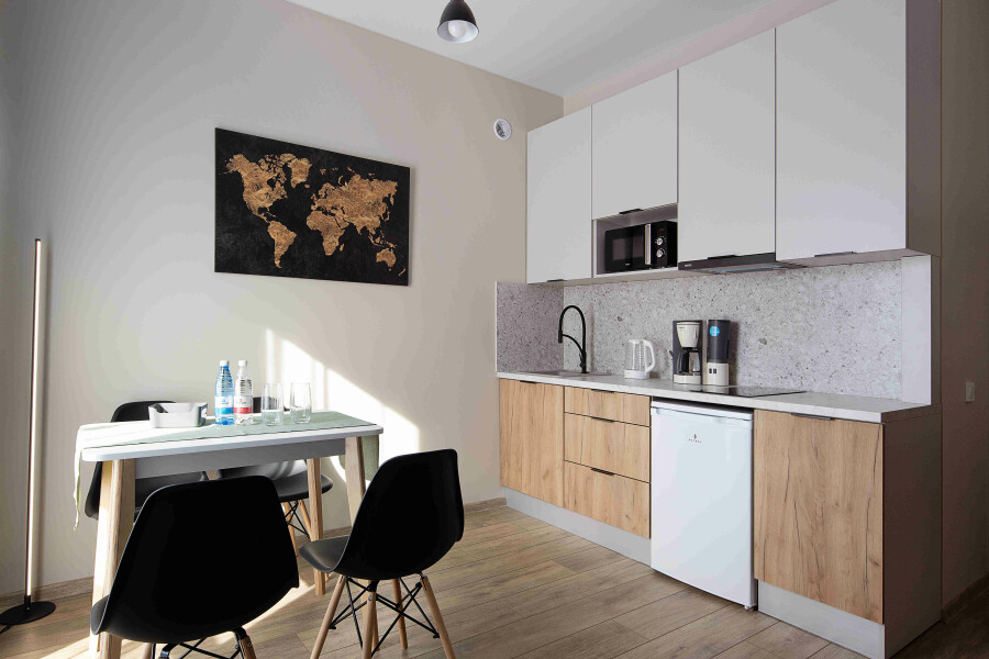 - Оборудование: кофемашина, микроволновая печь, мини-холодильник, набор посуды, плита электрическая, стиральная машина, телевизор ЖК, холодильник, чайный набор посуды, электрочайник