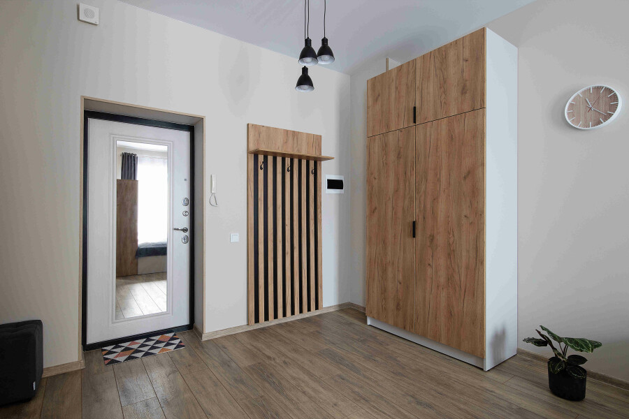 - Мебель: вешалка, зеркало, кровать двуспальная, стол, стулья, шкаф